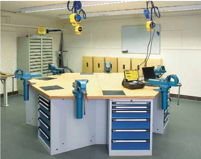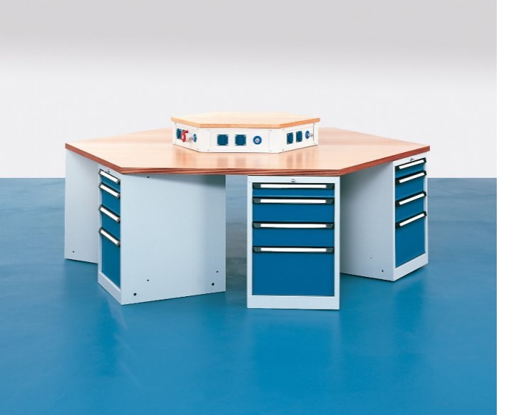 Les établis teamwork permettent d'avoir un large plan de travail hexagonal pour le travail en équipe. Chaque poste est équipé d'un caisson de rangement.