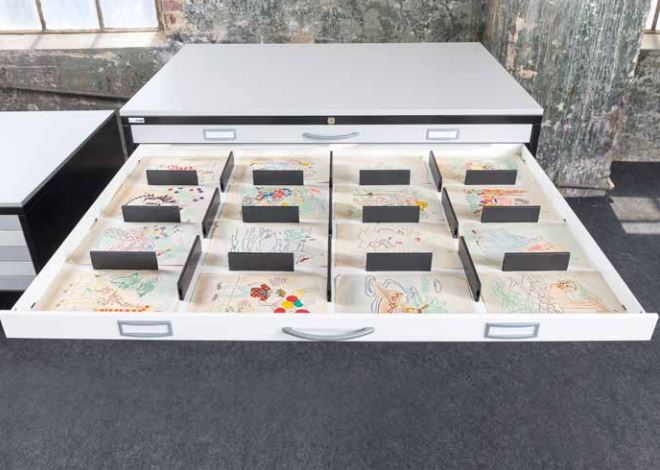 Les tiroirs peuvent être équipés par différents systèmes de compartimentage pour passer à des formats plus petit DIN A2, A3 et A4.